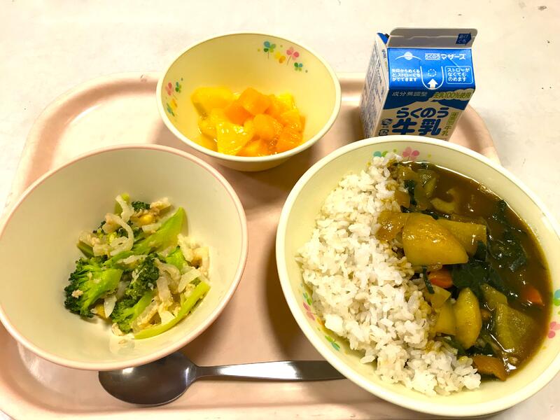 今日の献立は、冬野菜のカレー、牛乳、ブロッコリーのサラダ、フルーツのジュレ和え です。