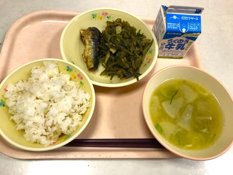 今日の献立は、麦ごはん、牛乳、いわしの生姜煮、ヤーコンのきんぴら、武光公鍋 です。