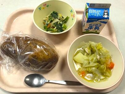 今日の献立は、あげパン、牛乳、ポトフ、小松菜のごまネーズ和え です。