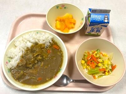 今日の献立は、ポークカレー、牛乳、コーンサラダ、フルーツカクテル です。