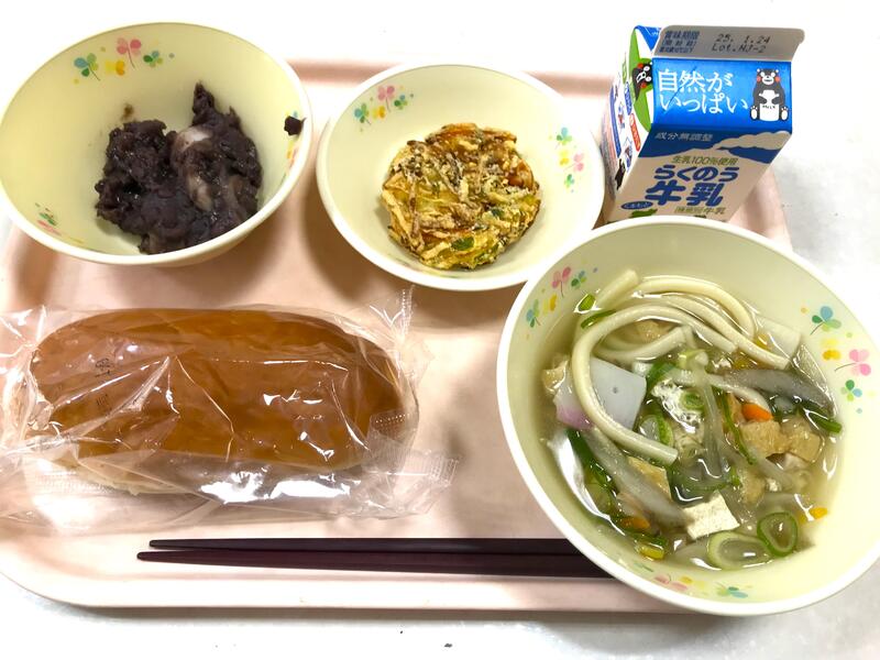 今日の献立は、ミルクパン、牛乳、五目うどん、野菜かきあげ、小豆白玉 です。