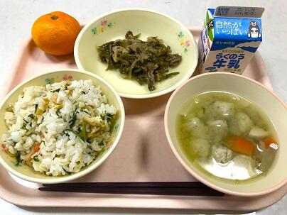 今日の献立は、高菜飯、牛乳、わかめスープ、魚の黄金焼き、カリカリきゅうり です。