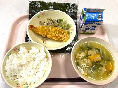 今日の献立は、セルフおにぎり、牛乳、えびの天ぷら、かぼちゃのみそ汁、ゆかり和え です。