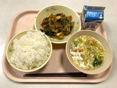 今日の献立は、ごはん、牛乳、たまごスープ、ほうれん草と厚揚げの中華炒め です。