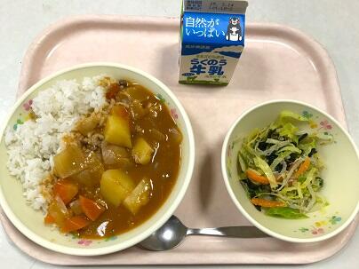 今日の献立は、キーマカレー、牛乳、大根サラダ、フルーツ杏仁 です。