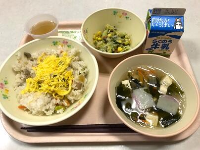 今日の献立は、キムタクごはん、牛乳、もずくスープ、春雨マヨサラダ です。