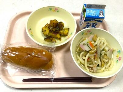 今日の献立は、ミルクパン、牛乳、五目うどん、大学いも です。