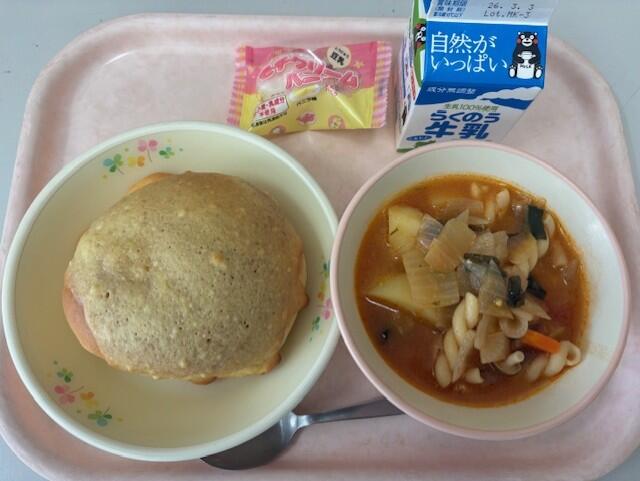 ぼうしパン、牛乳、冬野菜のミネストローネ、もちクリームバニラ