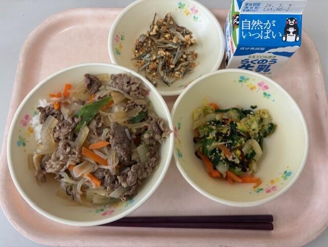 あかうし丼、牛乳、はくさいのこんぶあえ、いりことピーナッツ