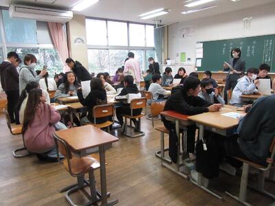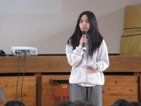 ボランティア委員会の発表は、今年度の活動のぎく荘への訪問、赤い羽根共同募金、書き損じはがきの寄付等の成果でした。