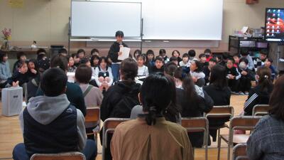 山鹿町出身で東京音楽大学在学中の鹿子木日向子さん(ヴァイオリン)とピアノ伴奏の方が演奏に来て下さいました。6年生は、素敵な演奏に聞き入っていました。