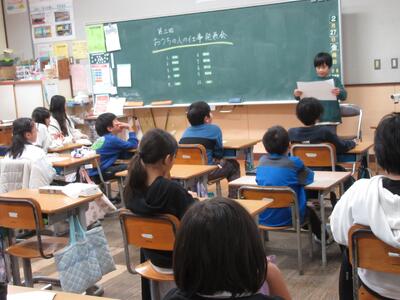 次に、各学級ごとに代表が振り返りを発表してくれました。それぞれに学級ごとに目標を決めてがんばっている様子がよくわかって、すばらしい発表でした。