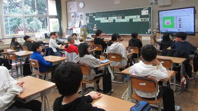 3年生の音楽の時間、「地域に伝わる音楽」として、おはやしを学習しています。今日は、DVDの「しのぶえ」の音に合わせて、音楽室にある楽器「大だいこ、しめだいこ、かね」を演奏してみました。最初は恥ずかしい、難しいと感じた子も多かったようですが、思い切って楽しくたたけるようになる子もいました。