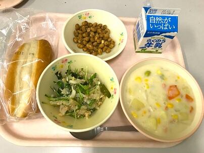 今日の献立は、ソフトフランスパン、牛乳、鮭と白菜のクリームシチュー、水菜とわかめのサラダ、黒糖ビーンズ です。
