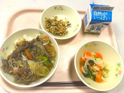 今日の献立は、あかうし牛丼、牛乳、かぶのゆず果和え、いりことアーモンド です。