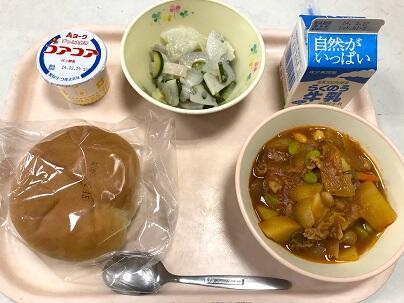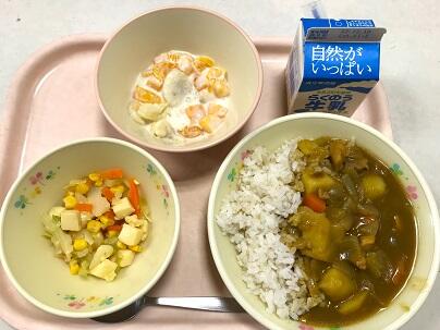 今日の献立は、チキンカレー、牛乳、豆乳サラダ、フルーツヨーグルト です。