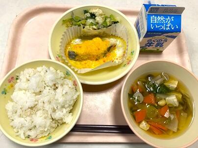 今日の献立は、麦ごはん、牛乳、魚のもみじ焼き、菜焼き、いちょう葉汁 です。