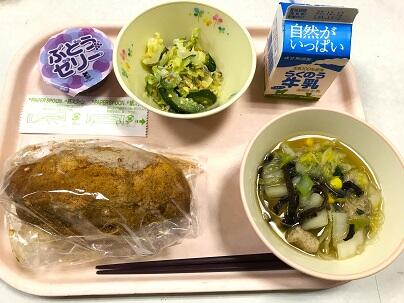 今日の献立は、あげパン、牛乳、肉団子スープ、かみかみサラダ、ぶどうゼリー です。