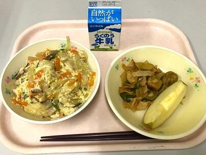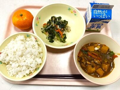 今日の献立は、南関あげ丼、牛乳、高野豆腐のカレー味、りんご です。