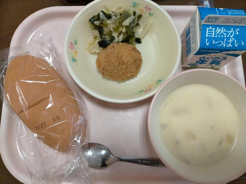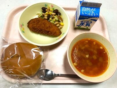 今日の献立は、コッペパン、牛乳、コーンクリームスープ、メンチカツ、海藻サラダ です。