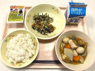 今日の献立は、麦ごはん、牛乳、みそおでん、ひじき和え、納豆 です。