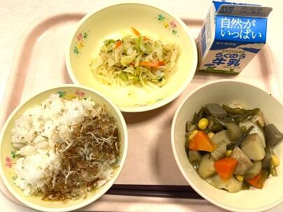 今日の献立は、麦ごはん、牛乳、じゃがいものうま煮、酢味噌和え、手作りふりかけ です。
