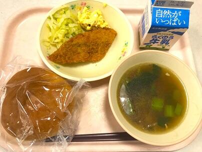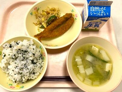 今日の献立は、わかめごはん、牛乳、さつまいものみそ汁、ししゃもフライ、もやしのごま和え です。