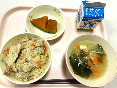 今日の献立は、中華おこわ、牛乳、玉ねぎのみそ汁、かぼちゃの煮物 です。