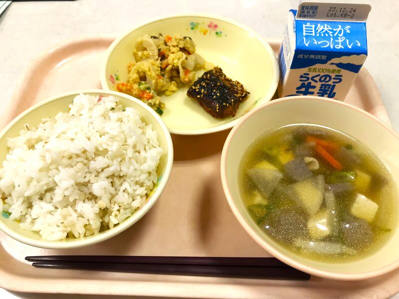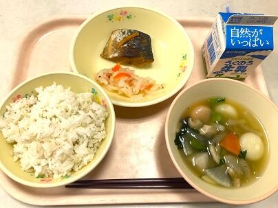 今日の献立は、麦ごはん、牛乳、さばのゆずみそ煮、紅白なます、雑煮 です。