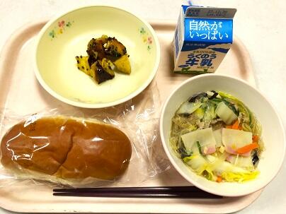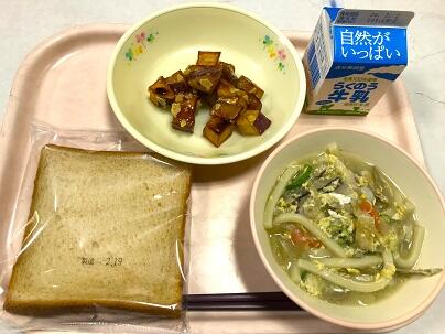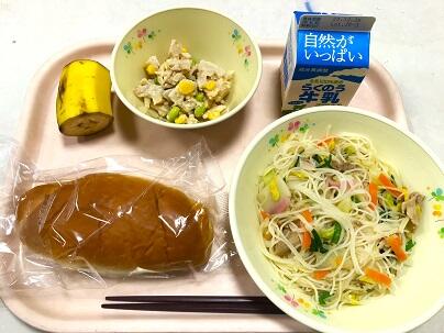 今日の献立は、ミルクパン、牛乳、タイピーエン、大学いも です。