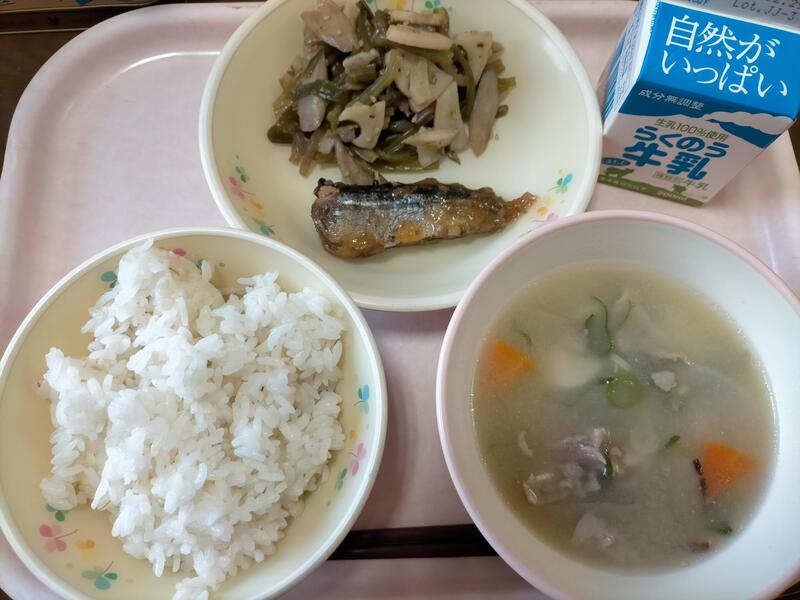 今日の献立は、麦ごはん、牛乳、さんまのみぞれ煮、きんぴら、武光公鍋 でした。