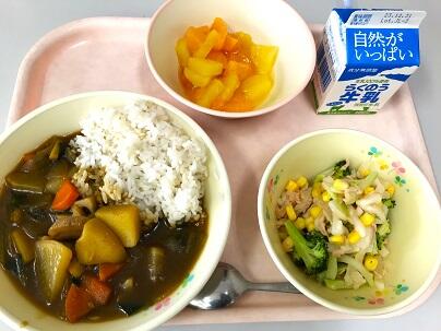 今日の献立は、冬野菜のカレー、牛乳、ブロッコリーのサラダ、フルーツのジュレ和え です。