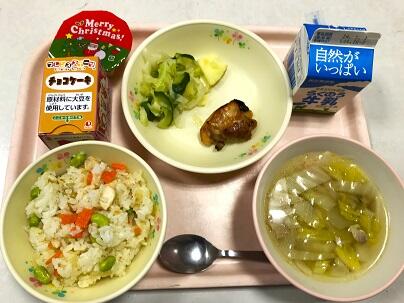今日で2学期最後の給食です。冬休みもおうちで3食しっかりごはんを食たべて、元気に過 すごしてほしいと願っています。よいお年を・・。