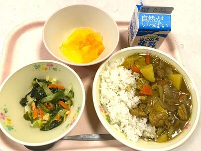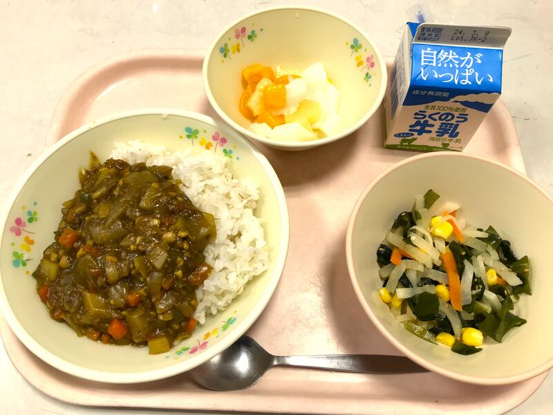 今日の献立は、ポークカレー、牛乳、きゅうりとわかめの酢の物、フルーツカクテル です。