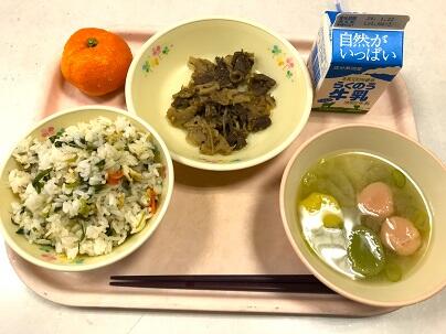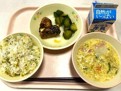 今日の献立は、高菜飯、牛乳、かきたま汁、里芋の田楽、カリカリきゅうり です。