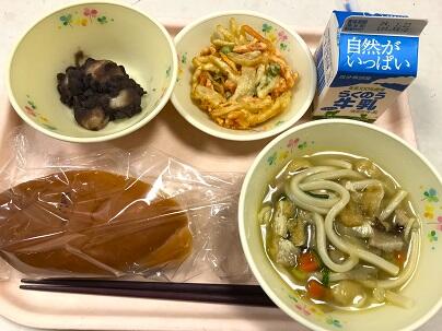 献立は、ミルクパン、牛乳、五目うどん、野菜かきあげ、あずき白玉 です。