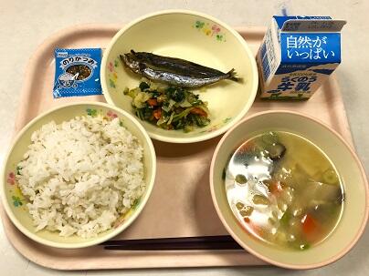 今日の献立は、麦ごはん、牛乳、呉汁、焼きししゃも、ほうれん草のごま和え、ふりかけ です。