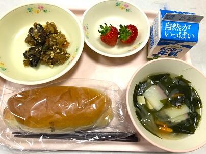 今日の献立は、ミルクパン、牛乳、鶏とレバーのカレー風味、わかめスープ、いちご です。