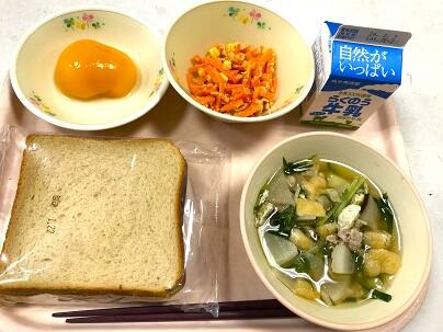 今日の献立は、黒糖パン、牛乳、豚肉と大根のスープ、人参サラダ、黄桃 です。