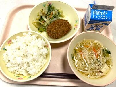 今日の献立は、麦ごはん、牛乳、くじらメンチカツ、魚そうめん汁、ほうれん草のおかか和え です。