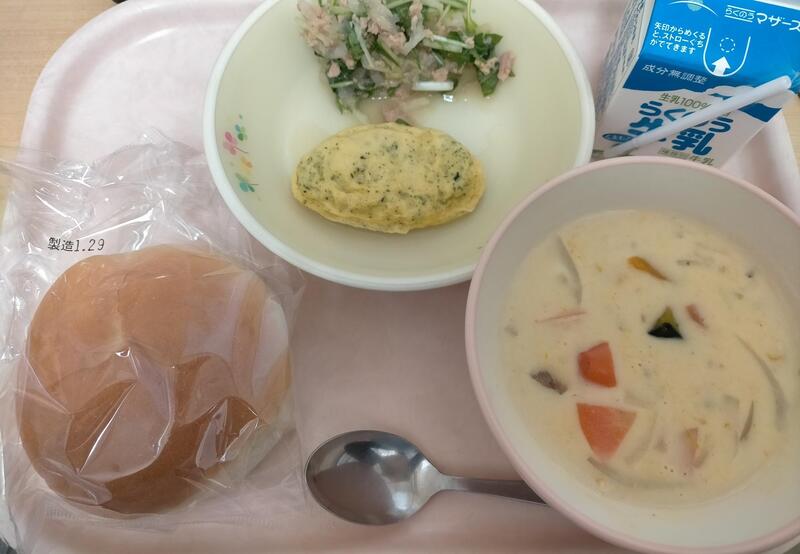 今日の献立は、まるパン、牛乳、かぼちゃのクリーム煮、ほうれんそうオムレツ、水菜のサラダ です。