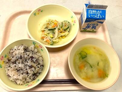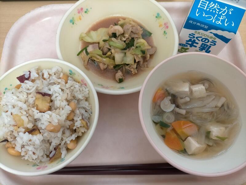 今日の献立は、さつまいもおこわ、牛乳、白菜のみそ汁、はるさめマヨサラダ です。