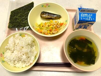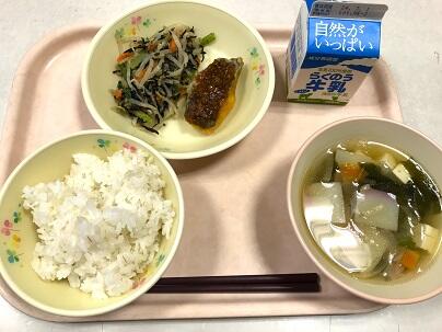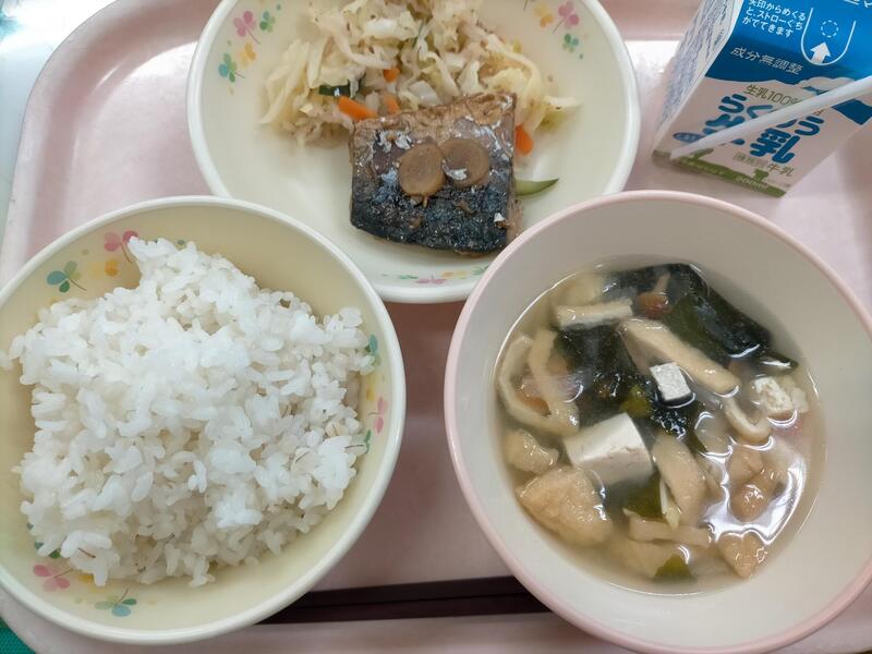 今日の給食は、麦ごはん、牛乳、さばの生姜煮、切り干し大根の酢の物、なめこ汁 です。