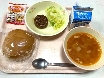 今日の献立は、セルフバーガー、牛乳、冬野菜のミネストローネ、節分豆 です。