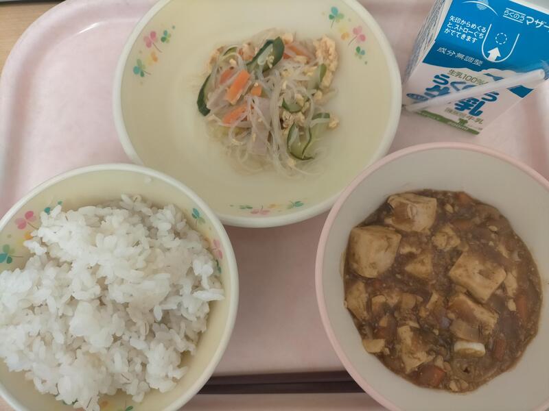 今日の献立は、麦ごはん、牛乳、マーボー豆腐、バンサンスー です。