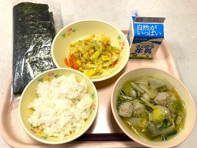 今日の献立は、セルフおにぎり(海苔・麦ごはん)、牛乳、ちゃんこなべ、じゃこ豆サラダ です。