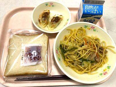 今日の献立は、食パン、牛乳、ソース焼きそば、ぎょうざ、いちごジャム です。