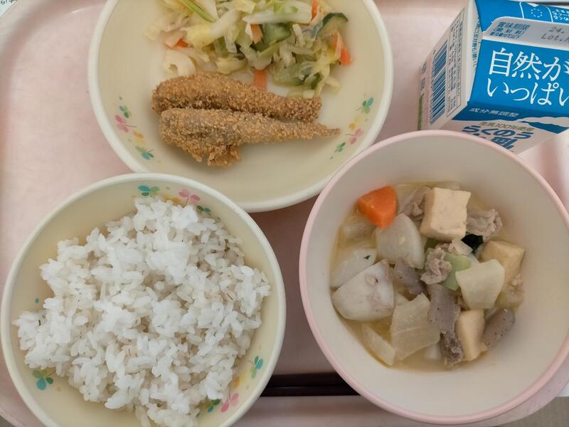 今日の献立は、麦ごはん、牛乳、豚肉と大根のごまみそ煮、野菜の梅肉和え、いわしのカリカリフライ です。