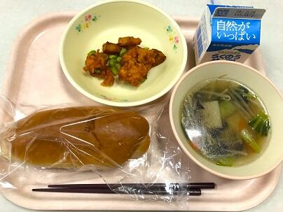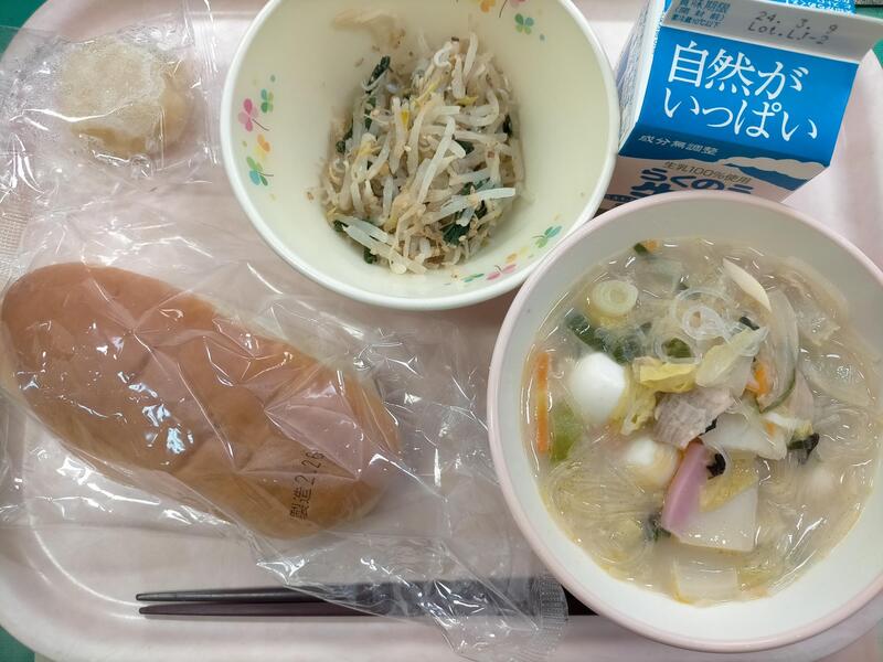 今日の献立は、ミルクパン、牛乳、タイピーエン、もやしの中華和え、いきなりだんご です。