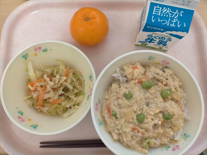 今日の献立は、炒り豆腐丼、牛乳、キャベツのごま酢和え、ぽんかん です。